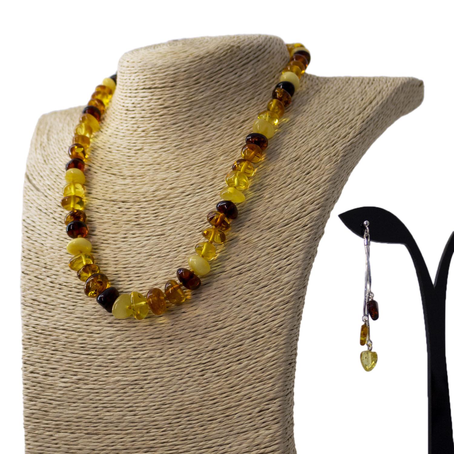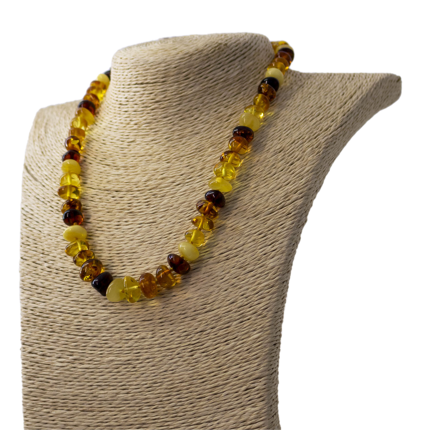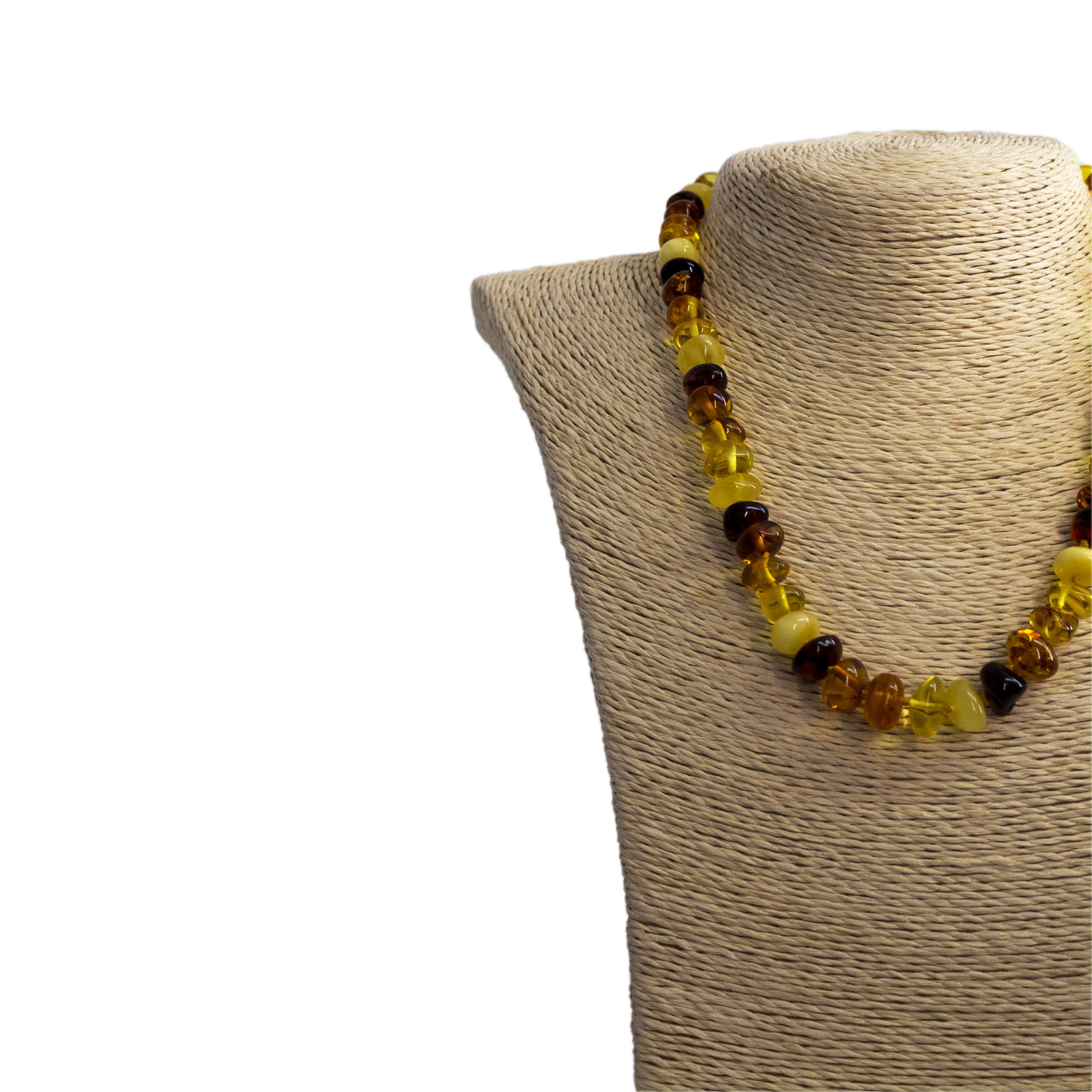 Bernstein ist versteinertes Baumharz und kein klassisches Mineral, aber oft als Schmuckstein genutzt. Besonders reichhaltige Vorkommen gibt es an der Ostseekรผste, in der Dominikanischen Republik und Mexiko. Bernstein enthรคlt manchmal einschlossene Insekten. Er symbolisiert Schutz, Wรคrme und Vitalitรคt. NAME: Bernstein Halskette FARBE: gelb, braun VERSCHLUSS: Haken