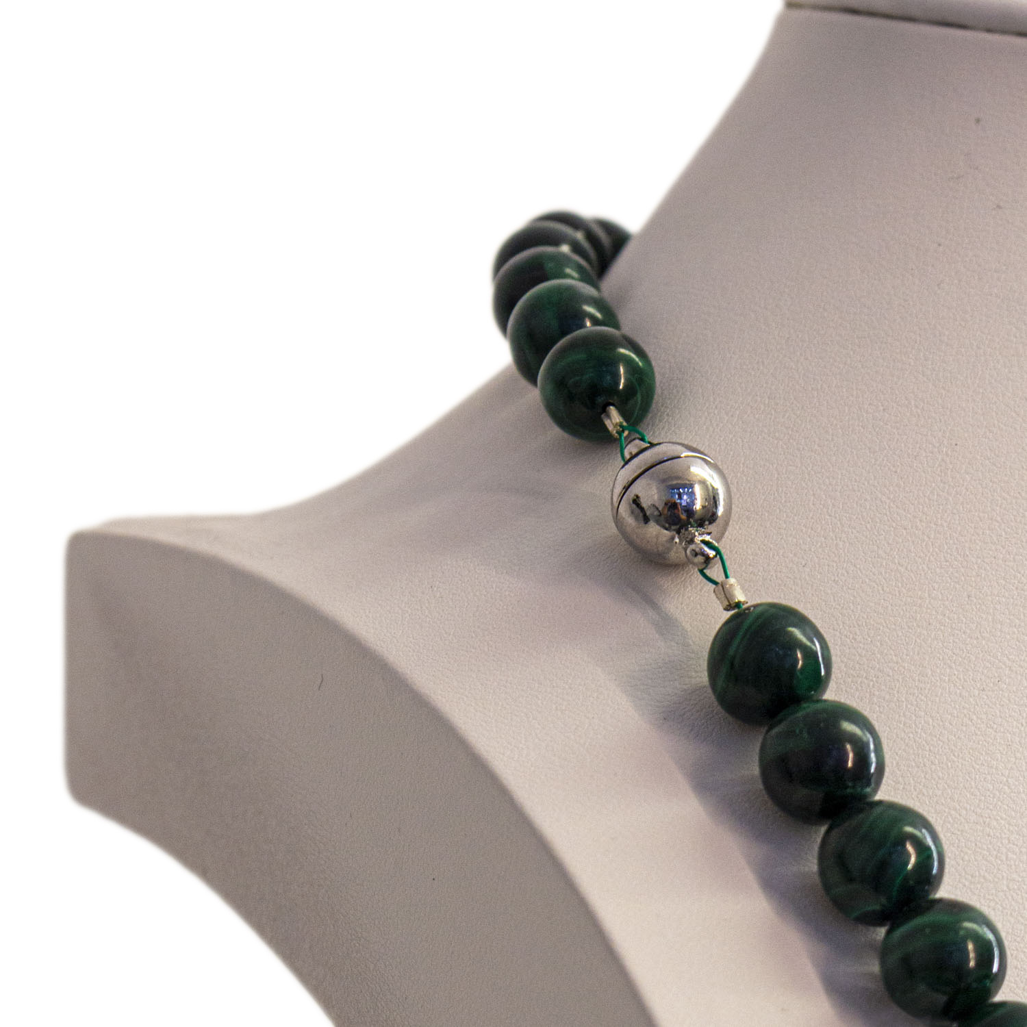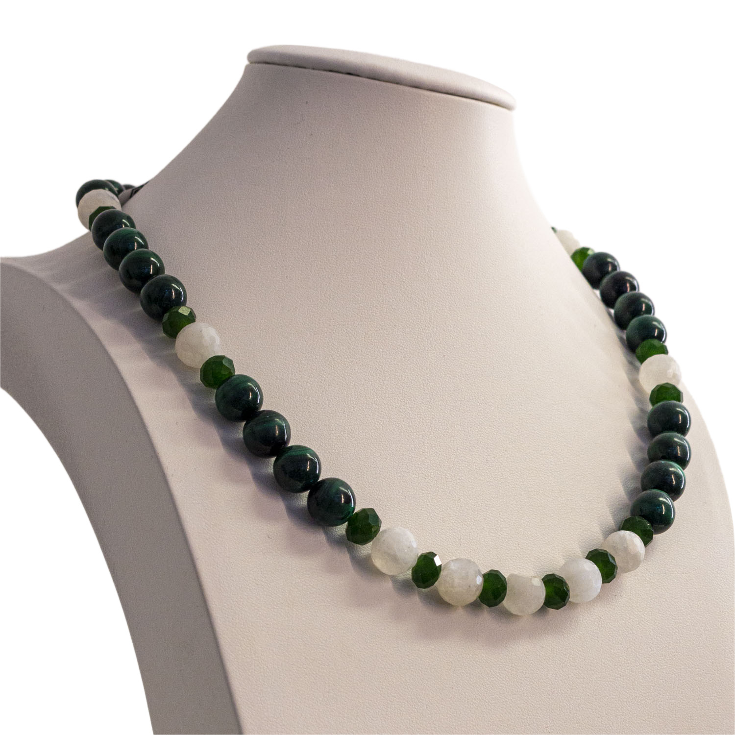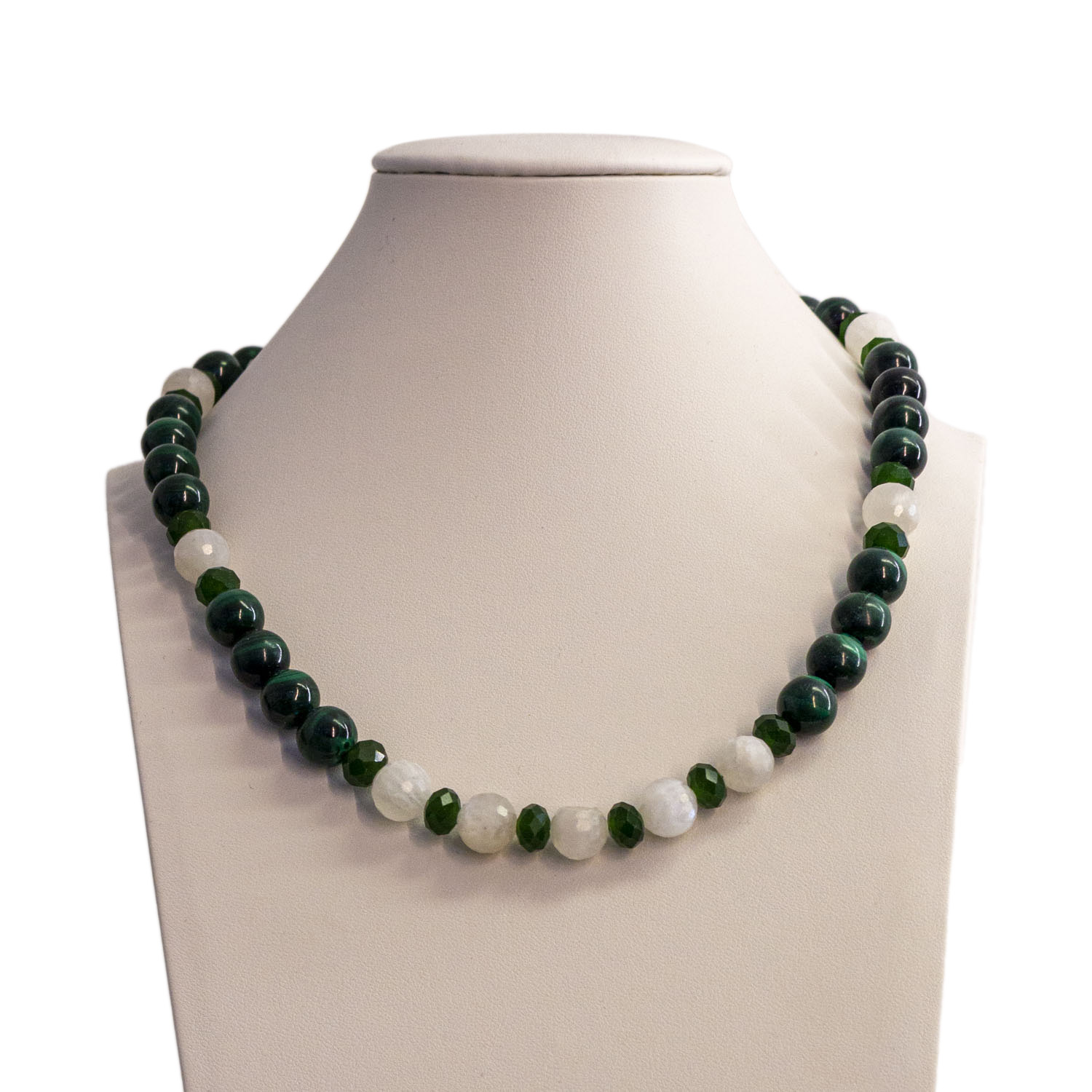 Malachit ist ein grรผn gefรคrbtes Kupferkarbonat-Mineral mit charakteristischen, oft gestreiften oder konzentrischen Mustern. Typische Fundorte sind Russland, Demokratische Republik Kongo, Australien und die USA. Malachit wird hauptsรคchlich fรผr Schmuck, Skulpturen und dekorative Objekte verwendet. Mit einer Mohshรคrte von 3,5โ4 ist er vergleichsweise weich und sollte vorsichtig behandelt werden. Symbolisch wird Malachit oft mit Schutz, Transformation und Heilung assoziiert. NAME: Malachit, Mondstein Edelstein Halskette FARBE: grรผn, weiร VERSCHLUSS: Magnetverschluss